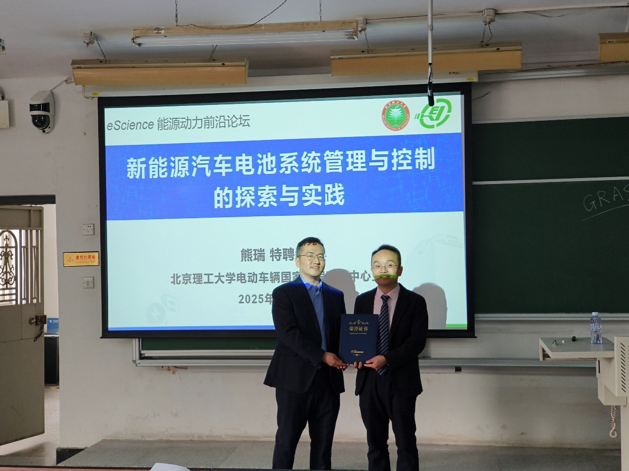 2025年10月24日下午,eScience能源动力前沿论坛邀请eScience Energy编委、北京理工大学熊瑞教授作了题为“新能源汽车动力电池系统主动管理与控制基础探索与实践”的报告,张凯研究员主持会议,并为报告人颁发证书。论坛开始前,熊瑞教授来到eScience编辑部进行了座谈交流。